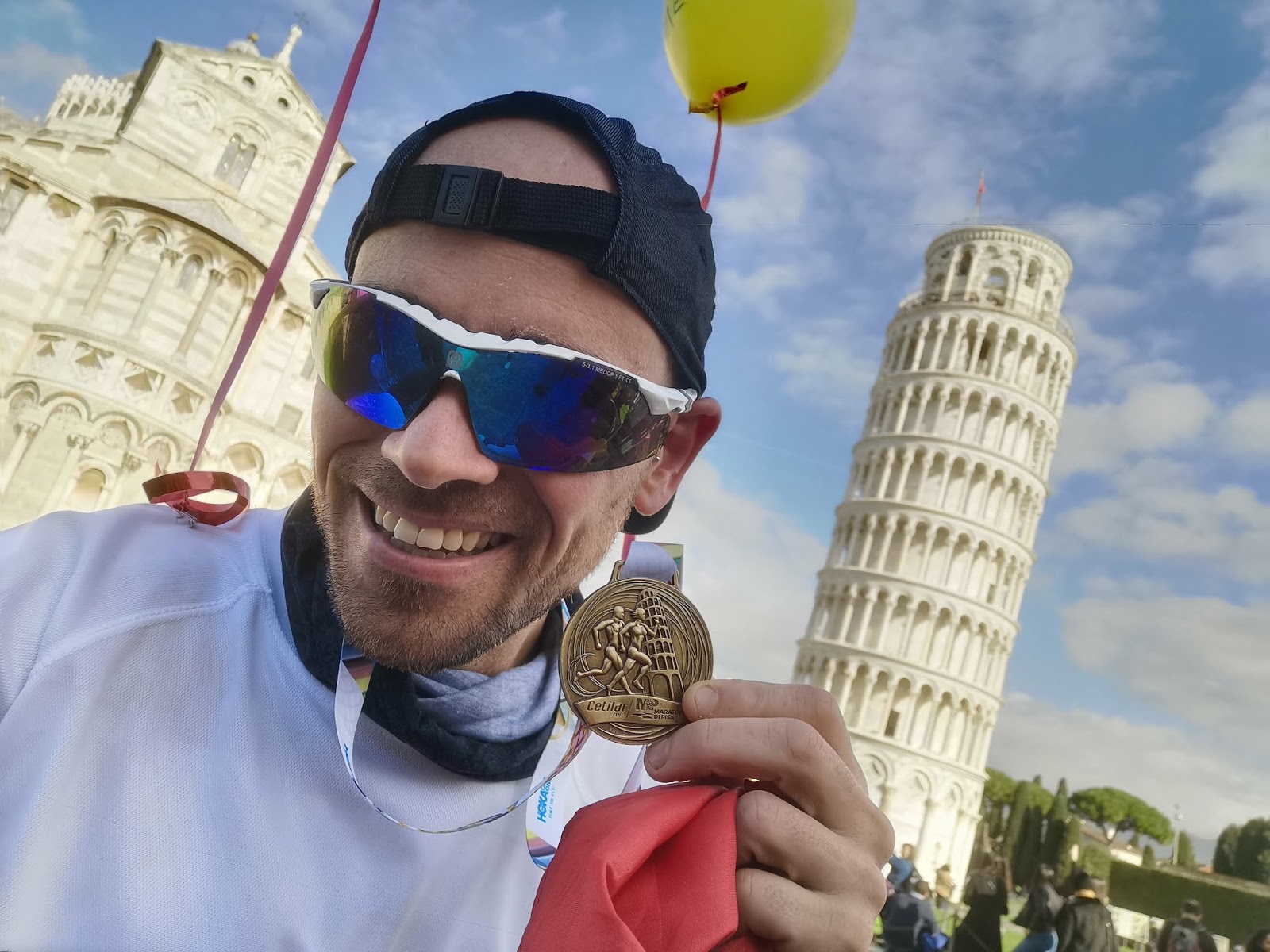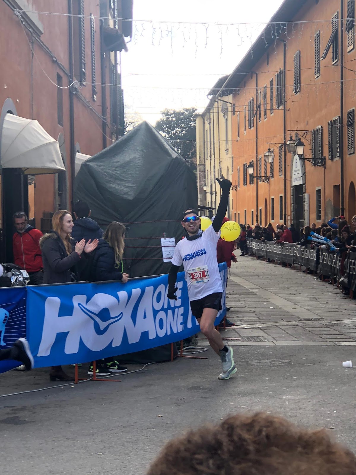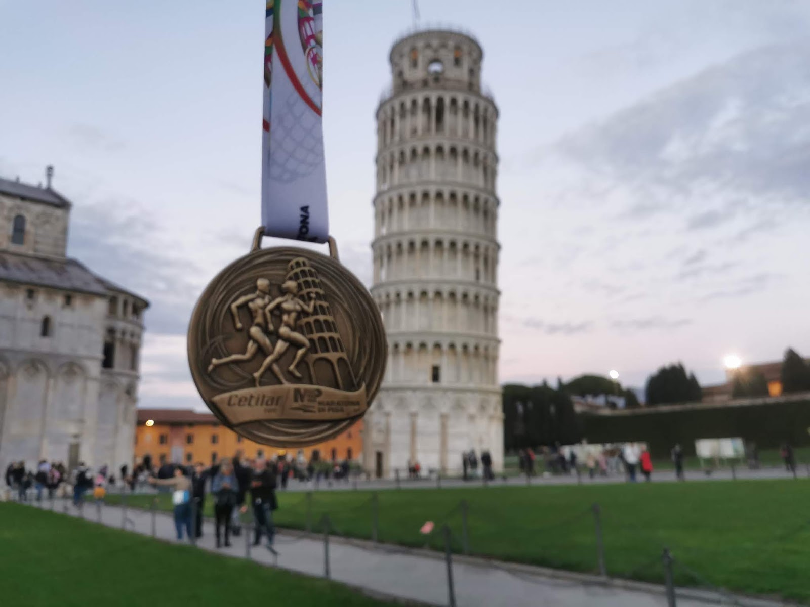 Dicho esto, nos adentramos en los últimos kilómetros ya en la ciudad de la torre inclinada para que por fin, se respire un buen ambiente maratoniano, ya que durante todo el recorrido no han habido más que dos grupos de música tocando (y cero personas), ya zigzaguando en los metros finales nos topamos de frente con dicha torre con la calle abarrotada de enloquecidos animadores que nos dan el último empujón para besar la gloria.