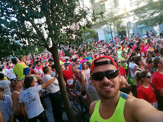 Carrera que empieza a las 10:00, 5 minutos después de La Legua, cuya esta edición ha sido la sexta y ha tenido unas 600 inscripciones. Mañana fresca con 14 grados, pero que según corrían los minutos iba subiendo el marcador de los termómetros sin control. Demasiado calor. Después de saludar a unos  cuantos compañeros de «adicción» calentaba no más de cinco minutos y me ponía en línea de salida, esta vez en la zona intermedia, ya que otros años, he jugado con el factor adelantamiento y