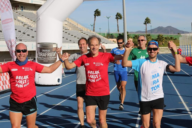 Después de haberme lesionado a falta de escasos 10 días y haberme sometido a una punción seca, todo apuntaba a que correría, pero con miedo. A falta de 10 horas para el pistoletazo de salida así creo que va a ser, aunque mi gemelo externo haya estado respondiendo a la perfección. El lunes y jueves un descanso activo de 40 minutos, el martes series largas 6×1000, y hoy sábado un trote cochinero que ha coincidido con el BREAKFAST RUN: entrenamiento, no competitivo, por supuesto; que consistía en hacer una salida desde la pista de atletismo a un ritmo suave controlado durante 4’5km. Hasta ahí, algo normal; eso sí, carrera gratuita para quien quisiera acercarse, que cuando recogiera el dorsal del maratón, le daban una completa bolsa de corredor junto con una camiseta técnica. El punto fuerte, es que las dos caras invitadas a este evento iban a entrenar con nosotros: los dos mejores maratonianos españoles de la historia, Abel Antón y Martín Fiz.